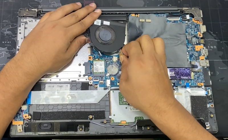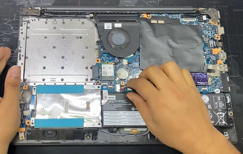 Bước 5: Tháo mặt đáy ra khỏi laptop, tại vị trí cáp pin laptop tháo đầu cáp ra khỏi bo mạch.