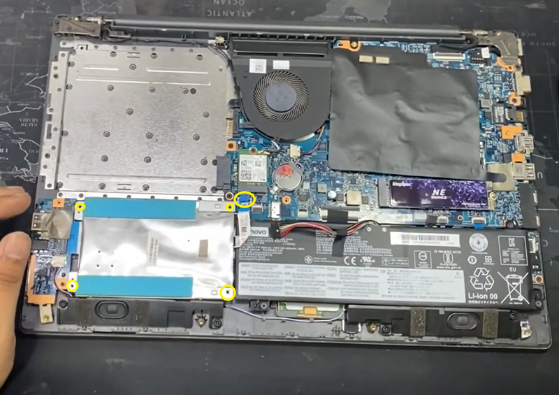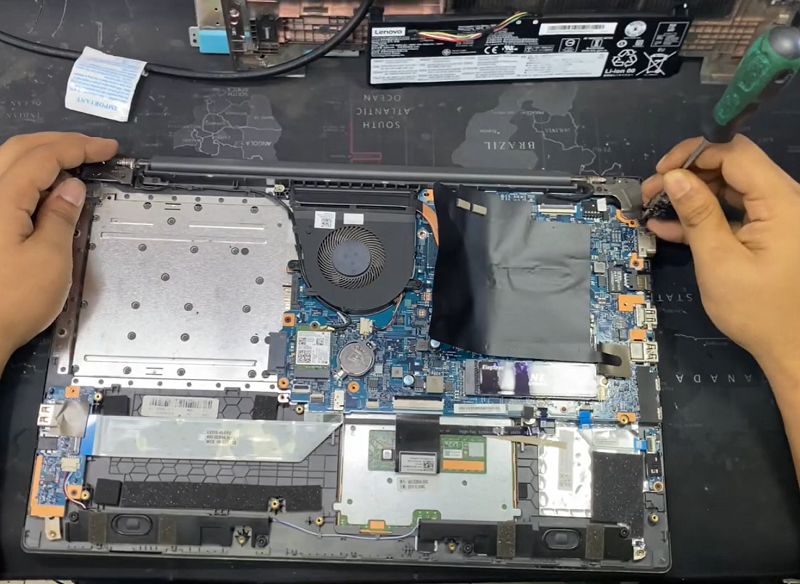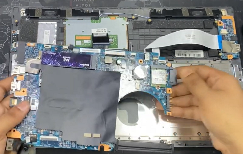 Bước 10: Tháo các con ốc cố định bo mạch chủ và nhấc bo mạch chủ ra khỏi laptop.