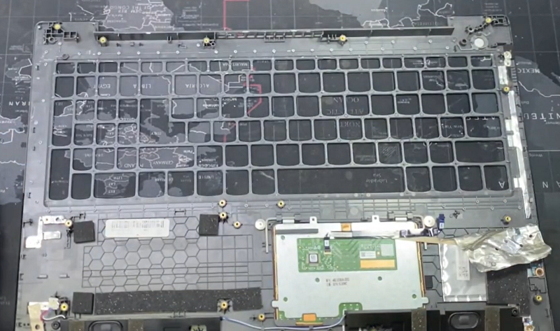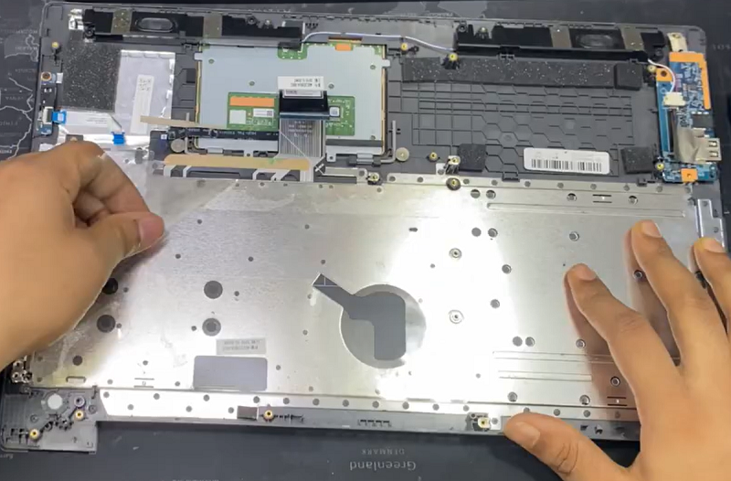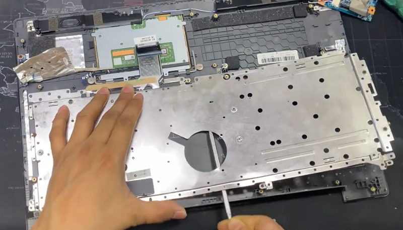 Bước 12: Sau khi tháo tấm cách điện ra thì tiến hành cậy tấm kim loại phía trên bàn phím ra ngoài.