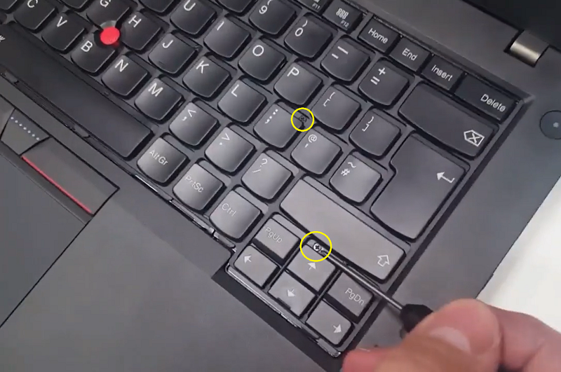 Bước 5: Mở lại laptop sau đó dùng dụng cụ cậy mở đẩy vào vị trí 2 chỗ lõm trên bàn phím theo lực từ dưới lên.