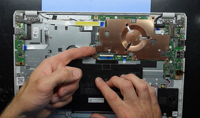 Bước 15: Úp laptop xuống và gắn lại cáp pin vào bo mạch chủ.