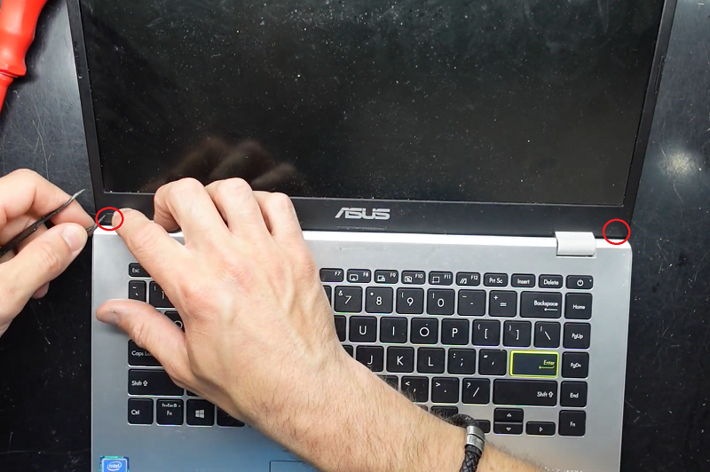 Bước 5: Lật lại laptop vào tiến hành tháo 2 miếng dán che vị trí 2 con ốc vít đằng trước màn hình ra.