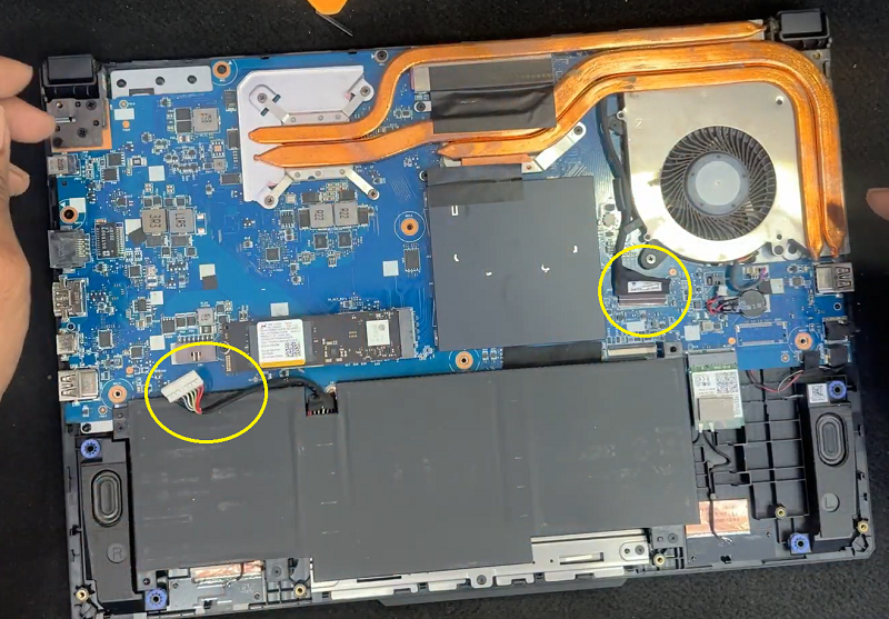 Bước 9: Úp laptop xuống sau đó gắn lại cáp màn hình và cáp pin vào bo mạch chủ.