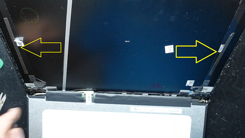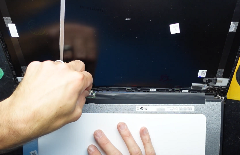 Bước 3: Mở lại laptop và dùng dụng cụ cậy mở chuyên dụng khóe léo cậy tấm nhựa bảo vệ mặt trước màn hình ra khỏi laptop.